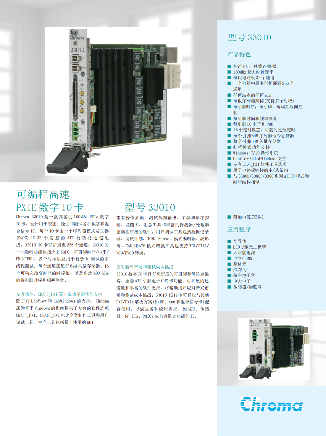 Chroma 33010 是一款高密度 100MHz PXIe 数字IO 卡,设计用于表征、验证和测试各种数字和混合信号 IC。