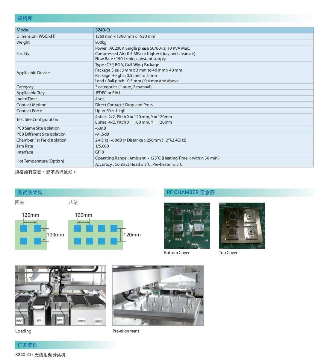 3240-Q是一台独特且创新、整合了射频和无线3240-Q也可依据测试需求支援各种不同类型封隔离室之自动分类机。